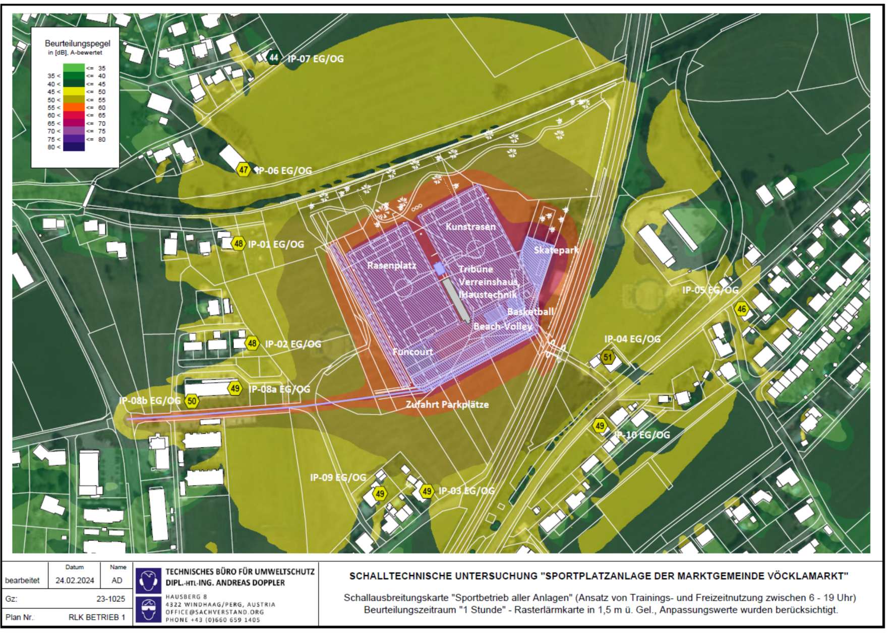 Am Beispiel des neu geplanten Sportplatzanlage der Gemeinde Vöcklamarkt ging es insbesondere darum, die zu erwartenden Sportgeräusche der Anlage zu bewerten und mit Maßnahmen wie z.B. eine Begrenzung von Sport-/Spielzeiten, vorteilhaftere Ausrichtung von Beschallungsanlagen etc. zu einer immissionstechnisch verträglichen Lösung zu kommen.